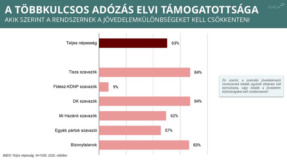 Az Idea kifejtette, hogy az egykulcsos jövedelemadó-rendszer minden jövedelemre azonos adókulcsot alkalmaz, míg a többkulcsos célja, hogy a magasabb összegekre nagyobb közterhet írjon elő, ezáltal mérsékelve a jövedelemkülönbségeket. Felmérésük szerint utóbbit várja el a szja rendszerétől a népesség közel kétharmada (63 százalék), és csak fele ennyien vélik úgy (30 százalék), hogy mindenkire ugyanazt az adósávot kell alkalmazni. Az Idea szerint az ellenzéki szavazók többsége, a Tiszára voksolók 86 százaléka – hasonlóan a DK-sokhoz – a jövedelemkülönbségek csökkentésének célja mellett áll, vagyis az Idea felmérése alapján a többkulcsos adót támogatja.