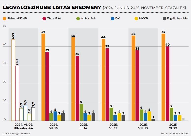A Fidesz továbbra is őrzi vezető helyét a választói támogatottság terén – derül ki a Nézőpont Intézet novemberi kutatásából. A Tisza Párt erős maradt, de nem tudta áttörni a 40 százalékos határt. A Mi Hazánk stabilan őrzi parlamenti pozícióját, míg több ellenzéki párt a bejutási küszöb alatt maradt.
