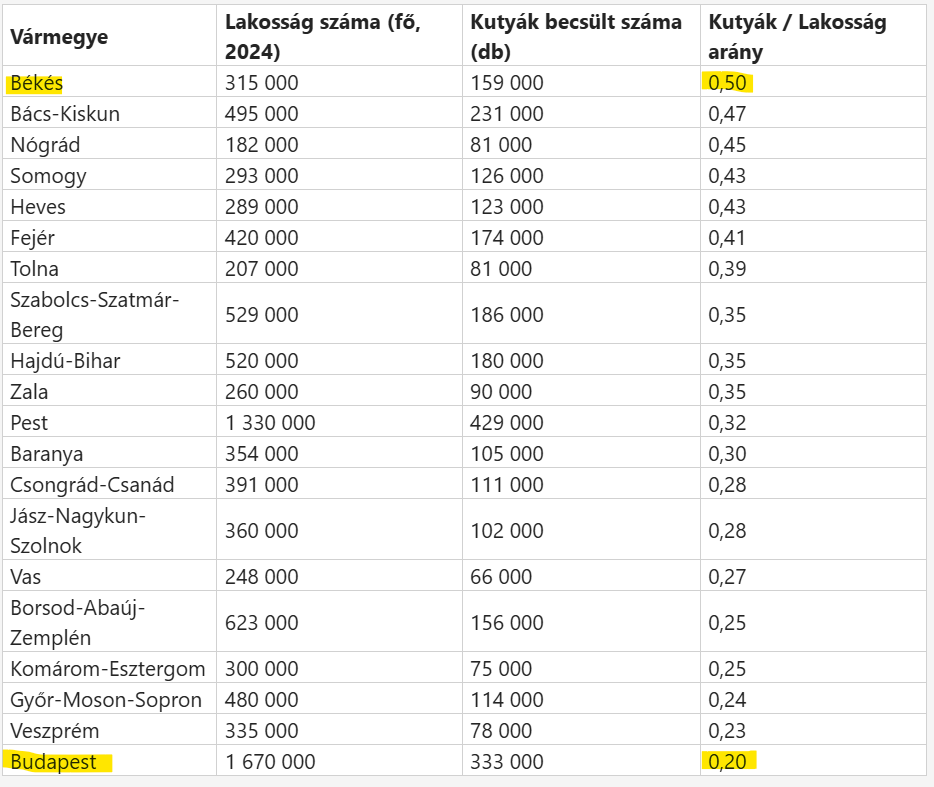 A statisztikák alapján Békés, Bács-Kiskun, Nógrád, Somogy, Heves és Fejér vármegyében kiemelkedően magas a kutyatartók aránya, Csongrád-Csanád vármegyében 391 ezer lakos közül 111 ezren tartanak kutyát.
