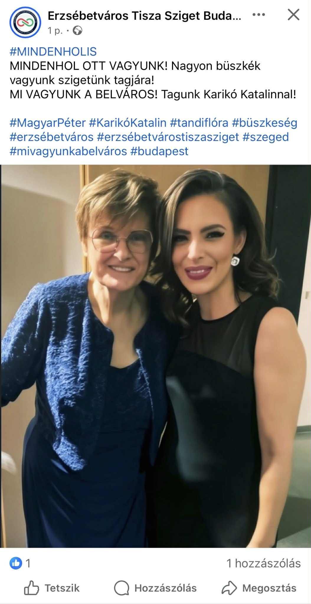 Meglepő bejegyzés jelent meg hétfőn az „Erzsébetváros Tisza Sziget Budapest VII.” elnevezésű Facebook-oldalon. A posztban Karikó Katalin, a Szegedi Tudományegyetem professzora, Nobel-díjas biokémikus, valamint Tandi Flora énekes szerepelt egy közös fotón. A képhez a következő szöveget írták: