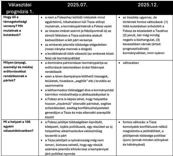 A politikai elemző a támogatottsági mérések mellett áttekintette a pártok erőforrásait, a 106 egyéni választókörzet állását, a kampánytémák alakulását, a gazdasági folyamatokat és a választók szubjektív helyzetértékelését.