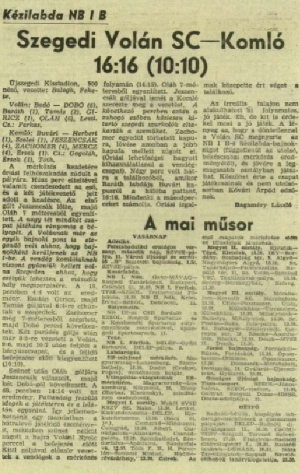 Szegedi Volán SC: Badó — Dobó 6, Baráth 1, Tamás 2, Giricz 1, Oláh 6, Lesti. Csere: Farkas (kapus). Vezetőedző: Kővári Árpád.