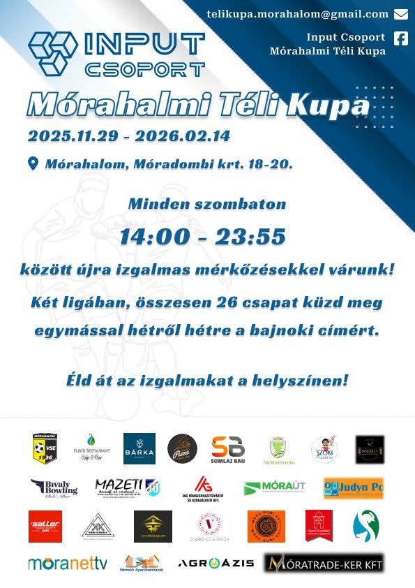 A hétvégén indul a térség egyik legjelentősebb kispályás labdarúgó-eseménye. Már az első, szombati játéknapon 14 órától csaknem éjfélig láthatnak mérkőzéséket az Input Csoport Mórahalmi Téli kupa keretein belül a kilátogató nézők. Izgalmakban nem lesz hiány.