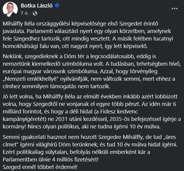 Botka László posztja másik részében Mihálffy Béla országgyűlési képviselő eredményeit vitatja kisiskolás módjára. Valószínűleg a saját politikai oldalával sem sokat beszél, mert Szeged kormánypárti országgyűlési képviselőjének munkájáról ott is elismerően beszélnek, de ezzel egy másik cikkünkben fogunk foglalkozni.