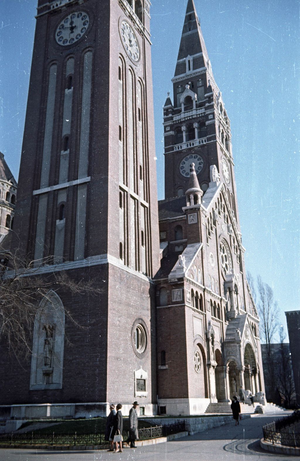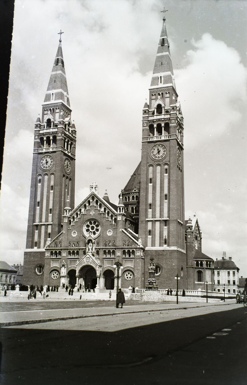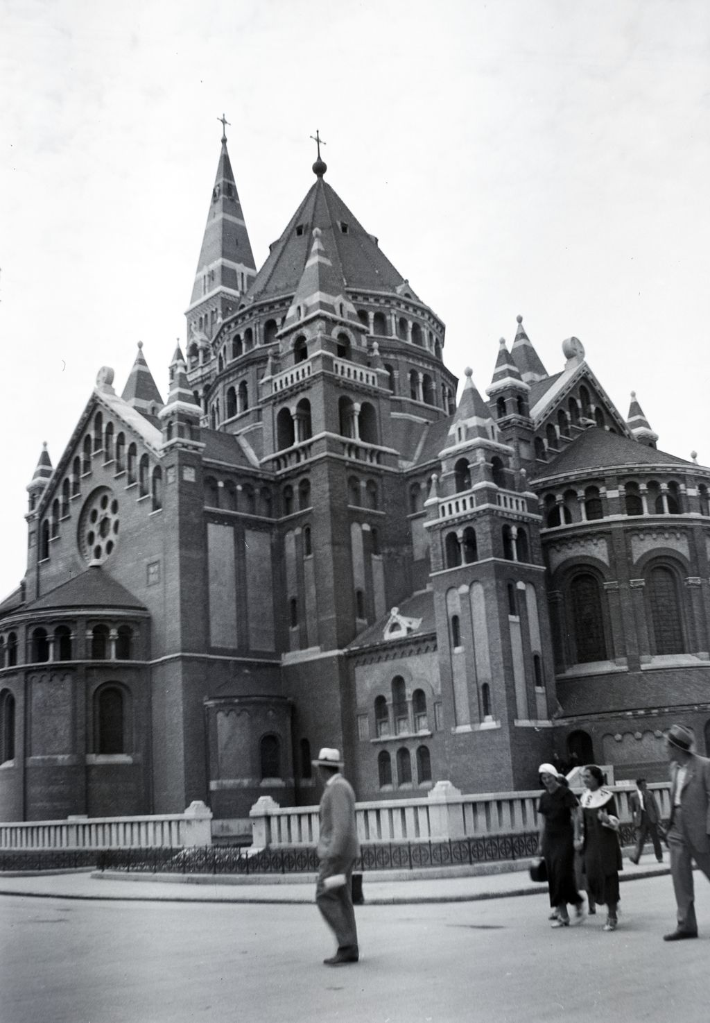 A Dömötör-templom bontása 1913-ban kezdődött, tornya – a ma is álló Dömötör-torony – megmaradt. Az alapkövet 1914. június 21-én tették le, de az első világháború kitörése miatt az építkezés félbeszakadt. A munkák 1923-ban folytatódtak, az új téglák színe ma is megkülönbözteti az addig elkészült részeket. A templomot 1930. október 24-én szentelték fel Horthy Miklós és Klebelsberg Kuno jelenlétében. Ekkor helyezték el Szent Gellért ereklyéjét, és Dohnányi Ernő Szegedi miséje is ezen az ünnepen hangzott el.