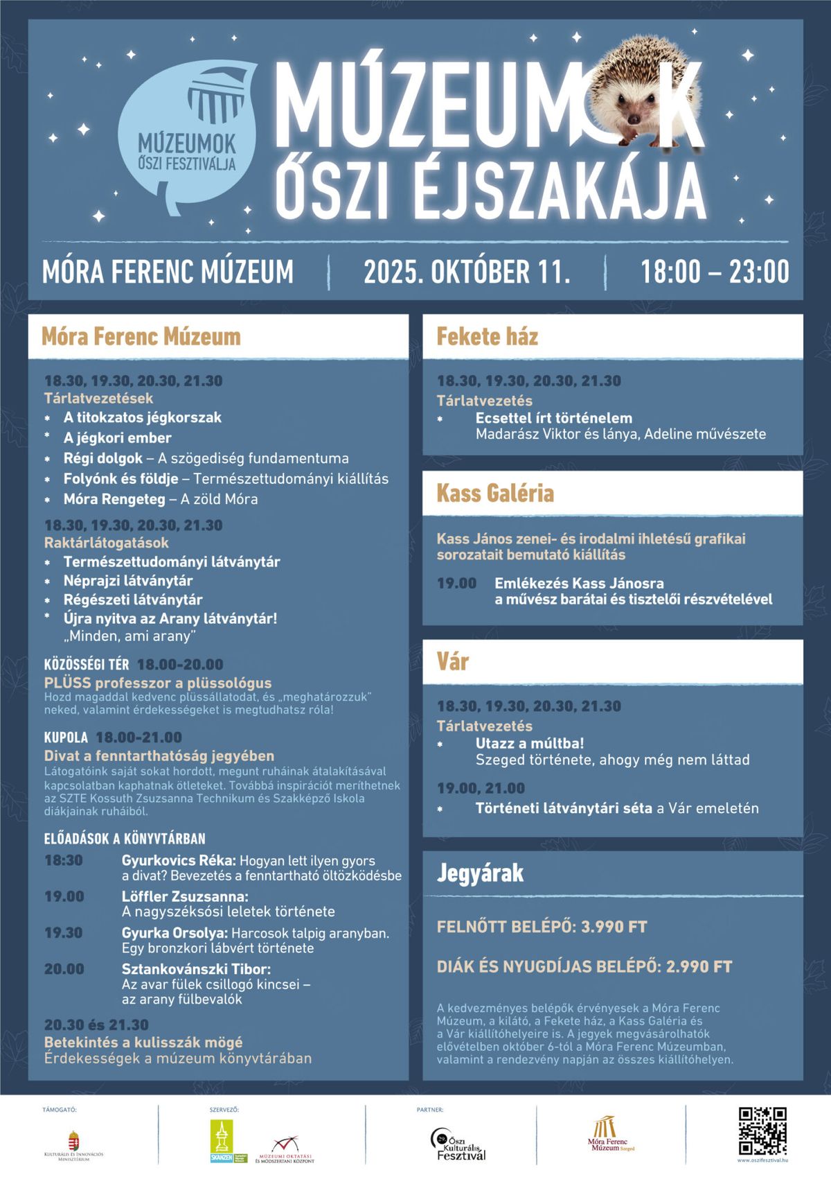 A Múzeumok Őszi Éjszakája (2025. október 11.) idén is Szeged kulturális élet egyik csúcspontja lesz, ahol négy szegedi intézmény – élén a Móra Ferenc Múzeummal – kínál egyedi esti programokat.