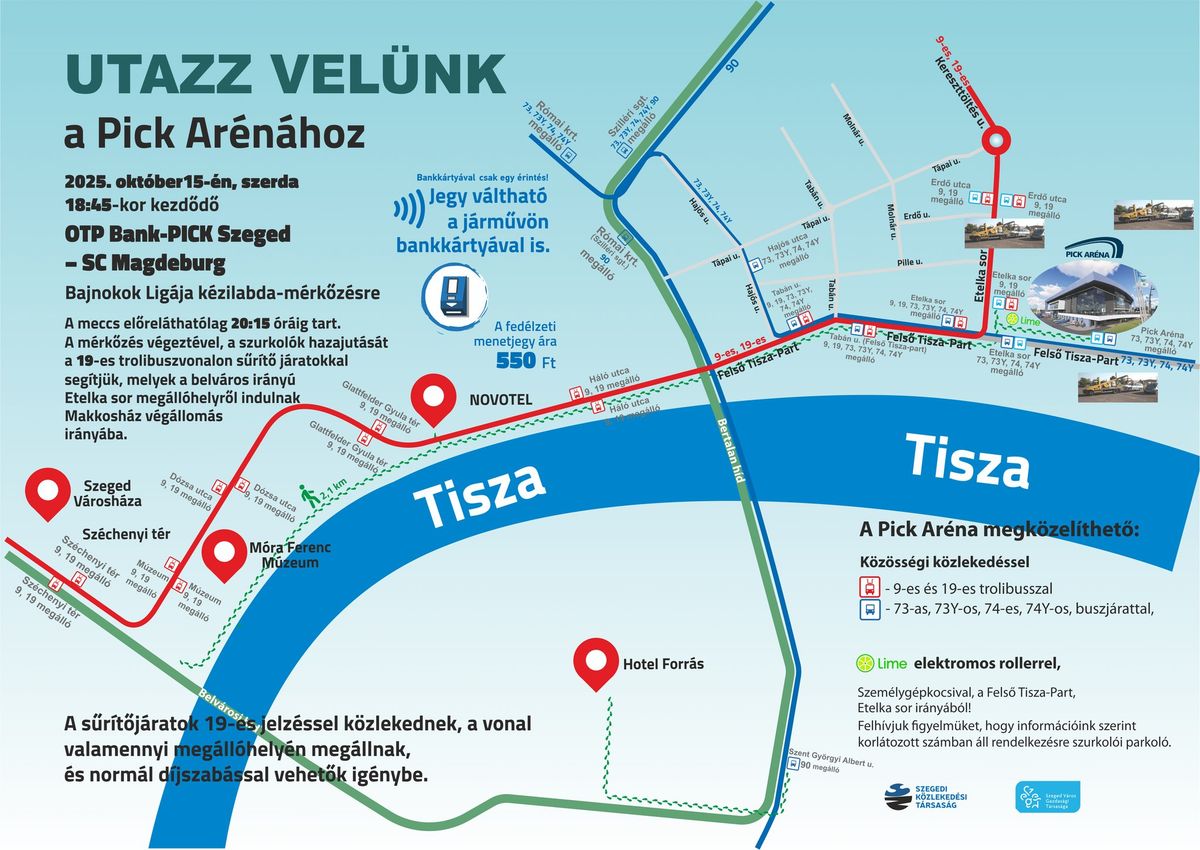 A szegedi szurkolóknak kedvez a Szegedi Közlekedési Kft. (SZKT ) az OTP Bank-PICK Szeged soron következő, kiemelt fontosságú Bajnokok Ligája mérkőzése kapcsán, amelyet 2025. október 15-én, szerdán 18:45-kor rendeznek a Pick Arénában az SC Magdeburg ellen. A mérkőzés után a helyi közlekedési vállalat speciális intézkedésekkel segíti a hazajutást: sűrítőjáratok indulnak a belváros felé a 19-es trolibuszvonalon.