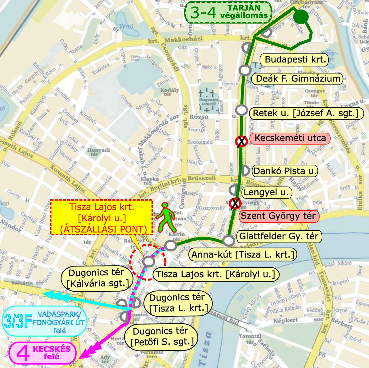 A „3–4” jelzésű pótlóbuszokra átszállás biztosított a Dugonics tér (Tisza Lajos krt.) és a Tisza Lajos krt. (Károlyi u.) megállóknál.