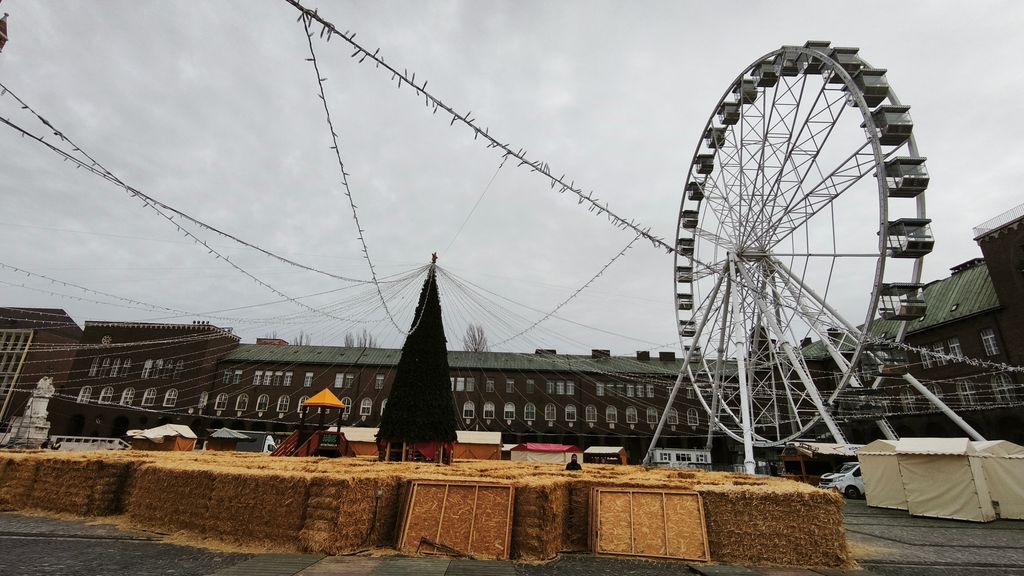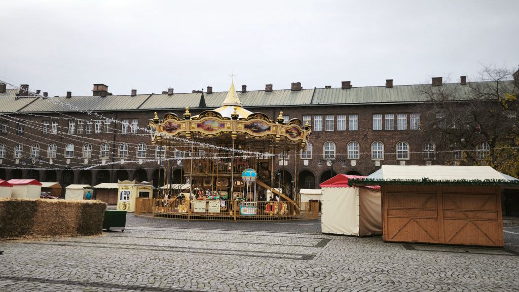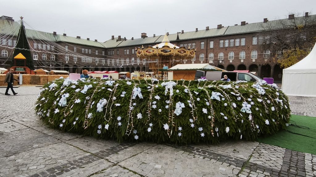 A Dóm téren már láthatjuk, hogy a fényháló és az ünnepi fények felkerültek a helyükre. Az adventi koszorút kihelyezték, ma délután még díszítették. A karácsonyfa már áll a tér közepén, körbeveszi az elkészült szalmabála labirintus. Az óriáskerék és a körhinta már üzemel egy ideje.