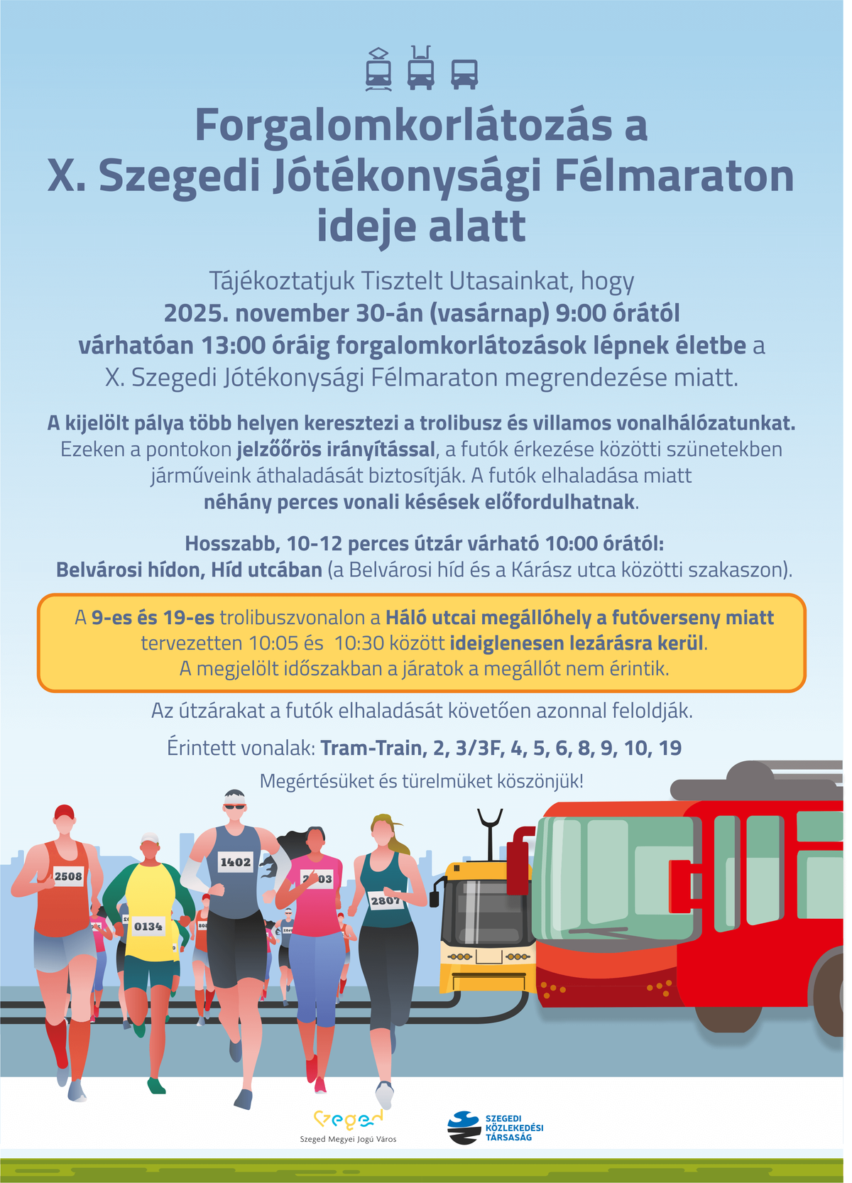 November 30-án, vasárnap rendezik meg a X. Szegedi Jótékonysági Félmaratont, amely idén is több távon zajlik majd, érintve a város közlekedését is. A verseny 9:00 órától várhatóan 13:00 óráig tart, ez idő alatt a város több pontján időszakos útlezárásokra és forgalomkorlátozásokra kell számítani.