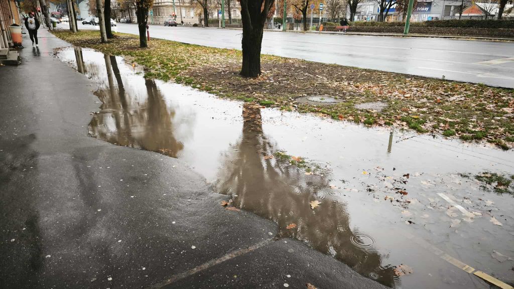 A helyszínen készült fotók alapján az elöregedett, régóta javításra szoruló járdaburkolat ismét alulmaradt a vízzel szemben. A repedezett, megsüllyedt részeken megülő víz nem csupán esztétikai problémát okoz; a tartós átázás gyorsítja az útburkolat további amortizációját.