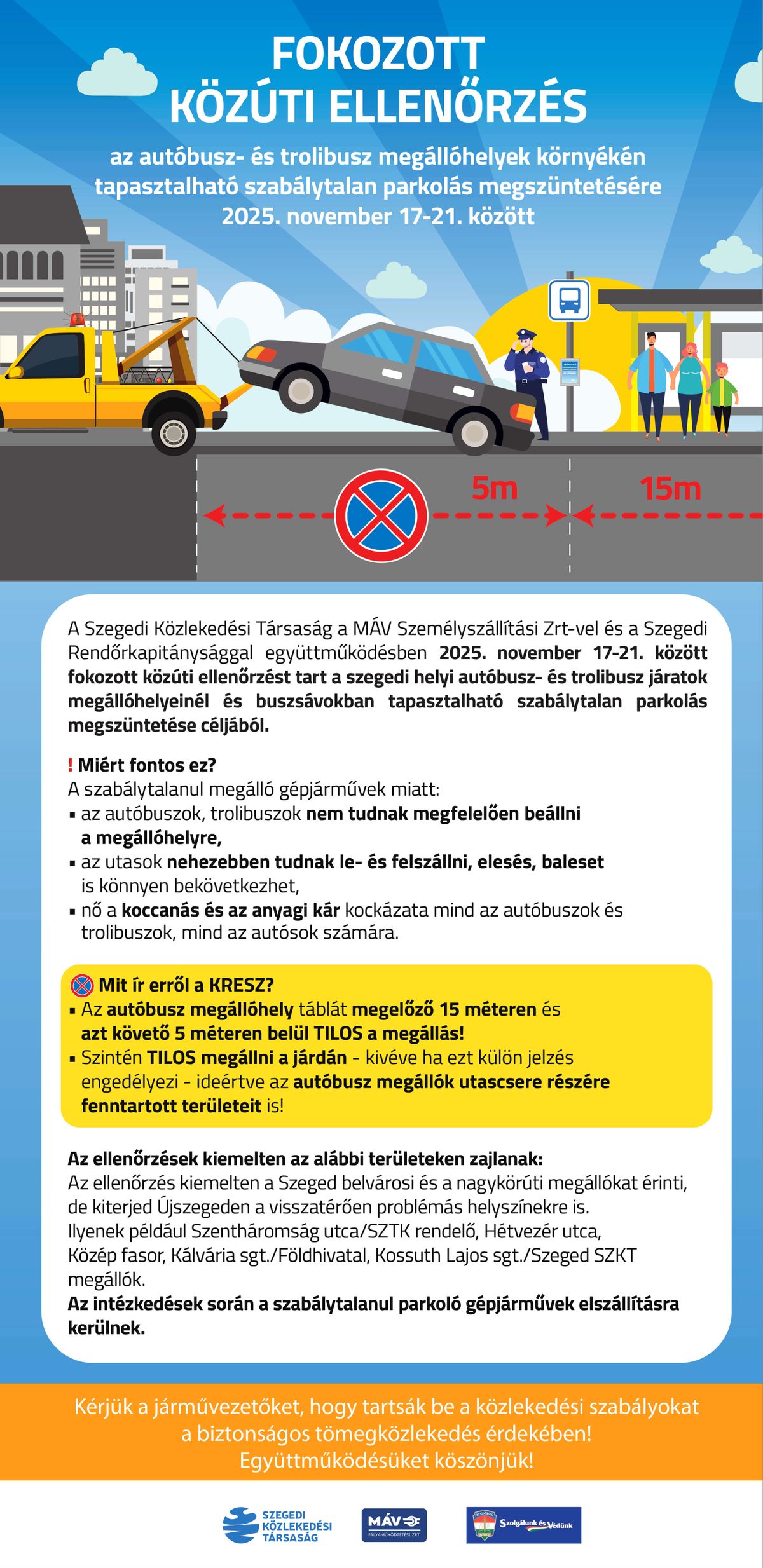 Összefogással lép fel a Szegedi Közlekedési Társaság (SZKT), a MÁV Személyszállítási Zrt. és a Szegedi Rendőrkapitányság az egyik legégetőbb helyi közlekedési probléma ellen. November 17. és 21. között ugyanis fokozott közúti ellenőrzést tartanak Szeged busz- és trolibuszmegállóinál, melynek célja az utasok biztonságát veszélyeztető, szabálytalan parkolás megszüntetése. A felelőtlen sofőröknek azonnali elszállításra és súlyos bírságokra kell számítaniuk.