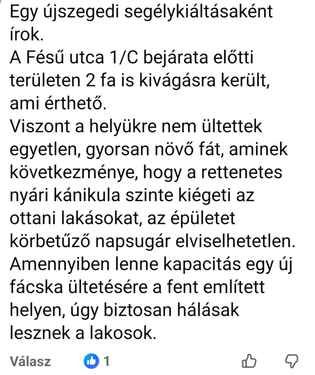 Szegeden városszerte rengeteg újonnan ültetett facsemete lelte már a gyors végét kiszáradás miatt. Az alább, képeken csatolt hozzászólásokban olvasható, hogy a város számos pontján igényelnek a lakosok a fákat, azonban azt is kérnék, hogy a foglalkozzanak is velük, hogy megmaradjanak.