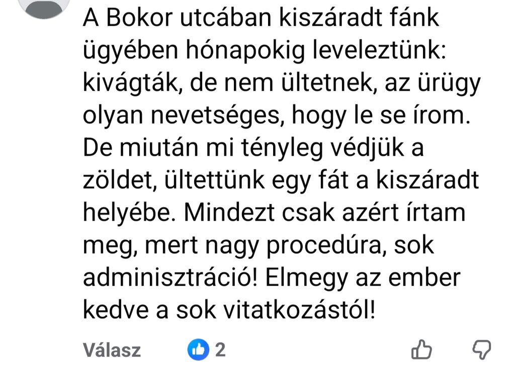 A Bokor utcában kiszáradt fák ügyében hónapokig leveleztünk, de nem ültetnek. Az ürügy olyan nevetséges, hogy le se írom. Elmegy az ember kedve a sok vitatkozástól