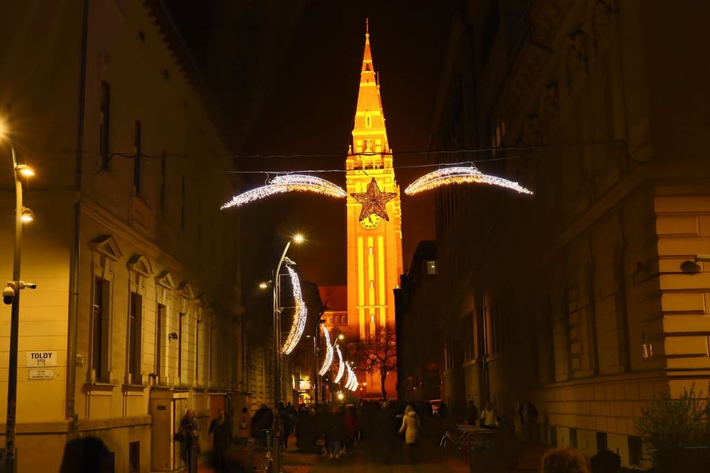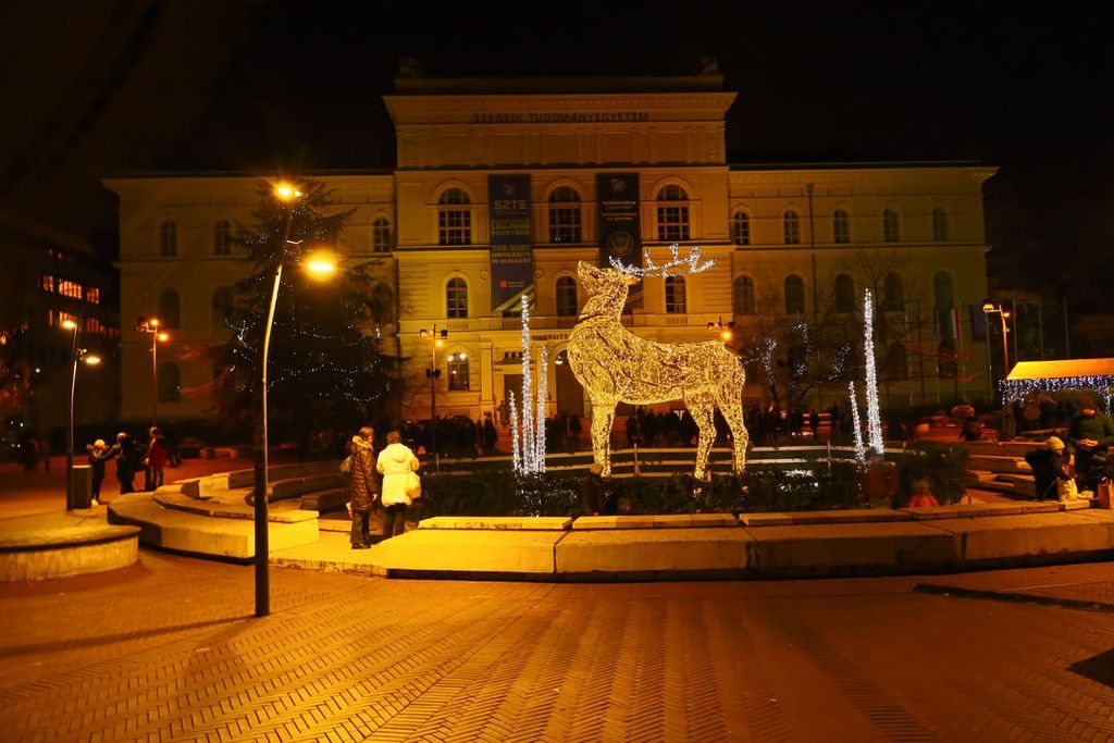 A belváros forgalmas pontjai, a Széchenyi tér, a Kárász utca, a Dugonics téri szarvas, a Dóm láthatóak mesebeli köntösben. A képek rögzítik az ünnepi díszvilágítás pillanatait, amely évről évre a Csongrád-Csanád vármegyei megyeszékhely egyik fő látványosságává válik. A város a klasszikus karácsonyi hangulatot ötvözi a télies, tiszta éjszakai látképpel.