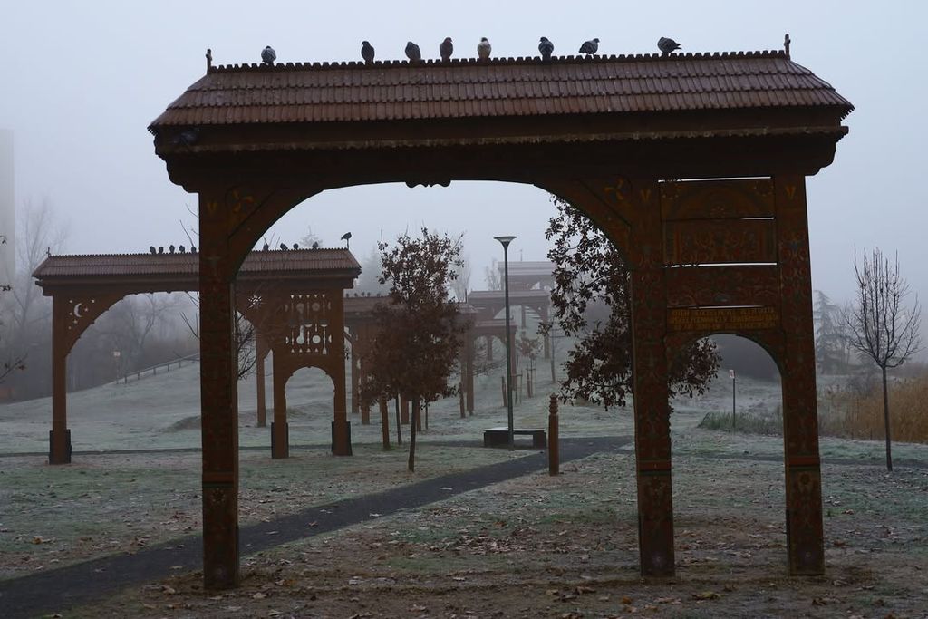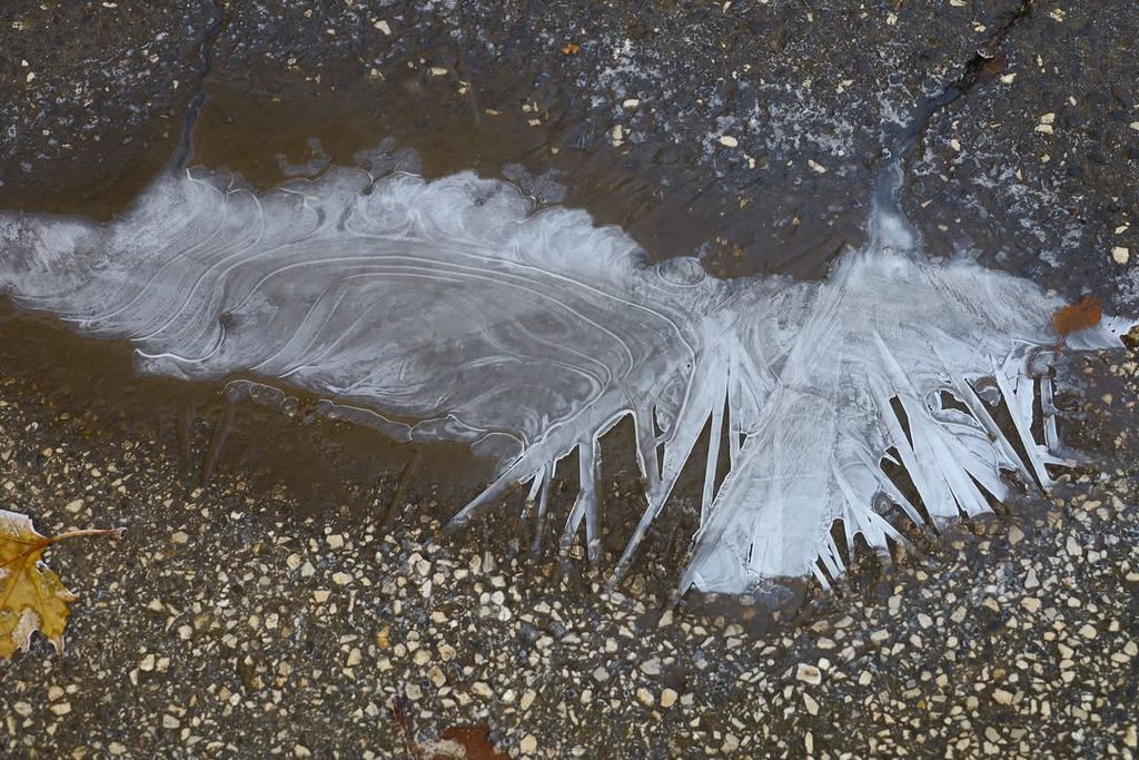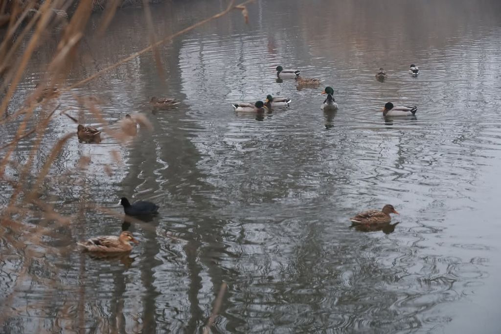 A folyóparton a víz szinte mozdulatlanná vált, a felszínén úszó récék és szárcsák békésen tűrték a hideget. A part menti fák ágaira fagyott dér finom rajzolatot adott a tájnak, a csipkebogyók élénk piros foltjai pedig kontrasztot vittek a szürke-fehér tónusok közé. A városi parkokban a faépítmények, kapuk és sétányok különös, kissé mesebeli hangulatot kaptak a deres fűben.