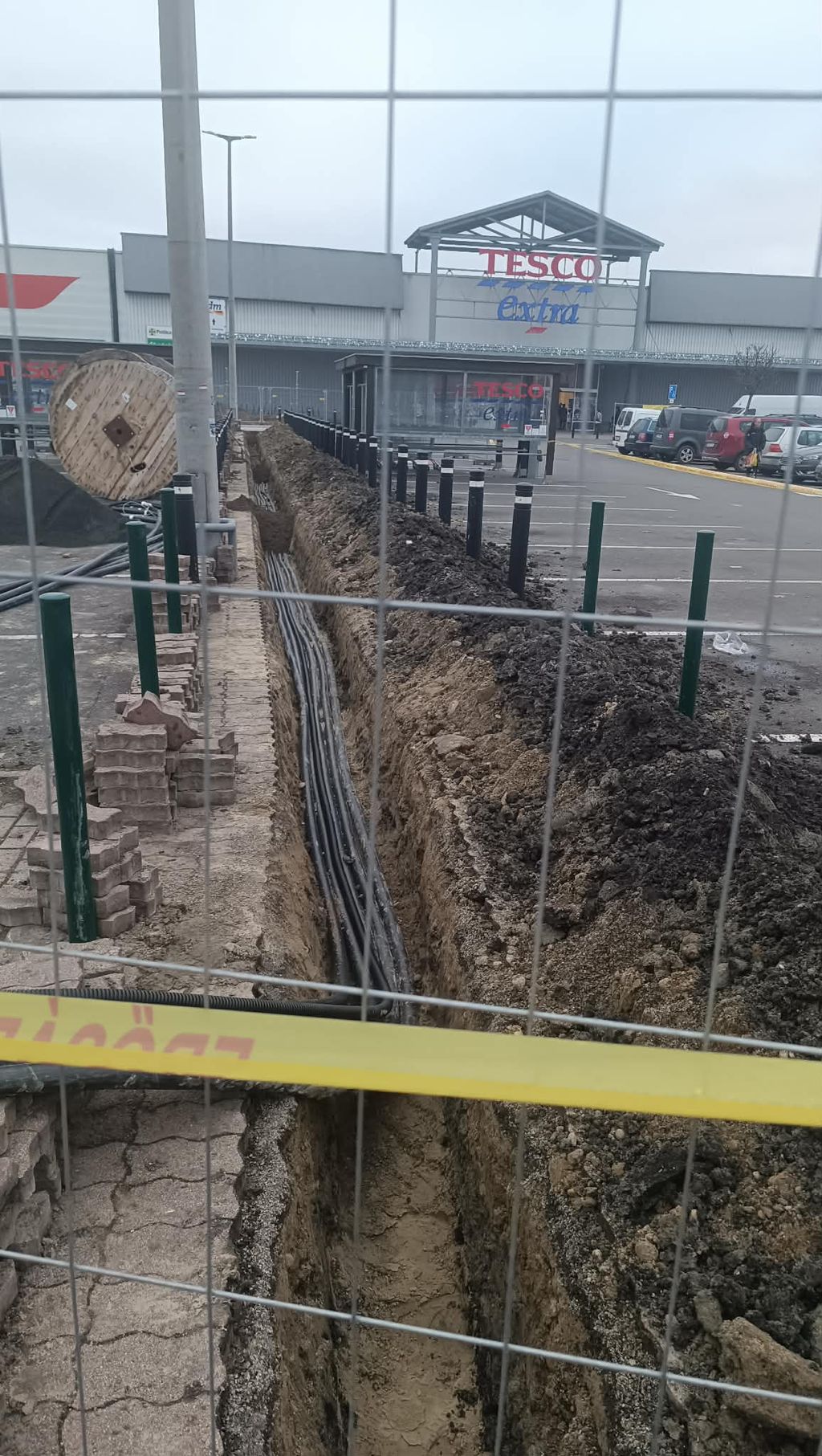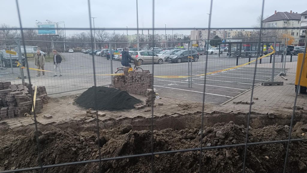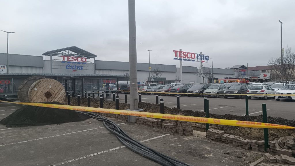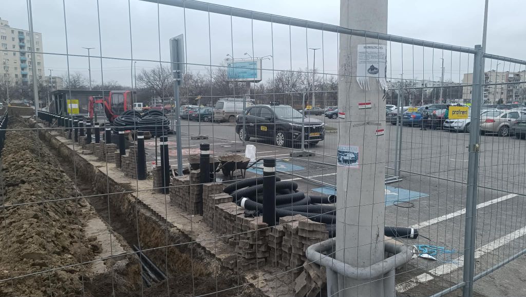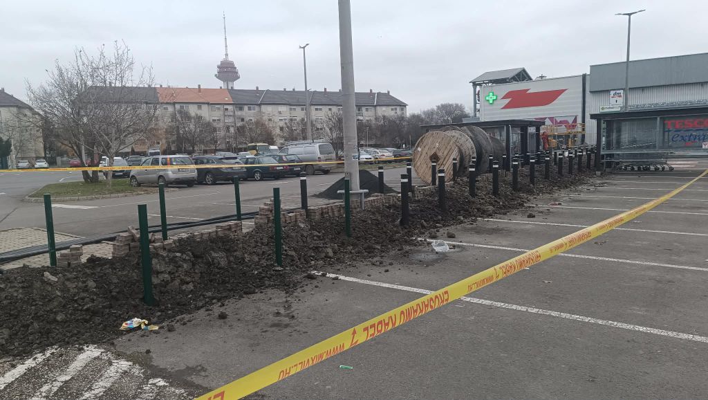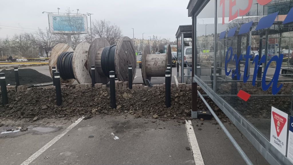A helyszíni képek alapján az áruház főbejáratához közel eső szakasz teljes hosszában fel van bontva: földmunkák, kábelárkok, építési kordonnal elzárt szakaszok és több méter hosszú kábeltekercsek sorakoznak a kijelölt területen.