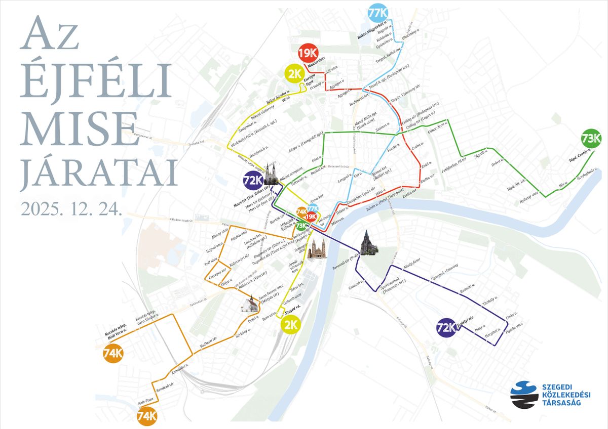 Hazaút: A mise után, 01:10-kor indulnak vissza a járatok a templomoktól a Széchenyi térre, ahonnan átszállás után mindenki eljuthat a külső végállomásokig (pl. Tarján, Újszeged).